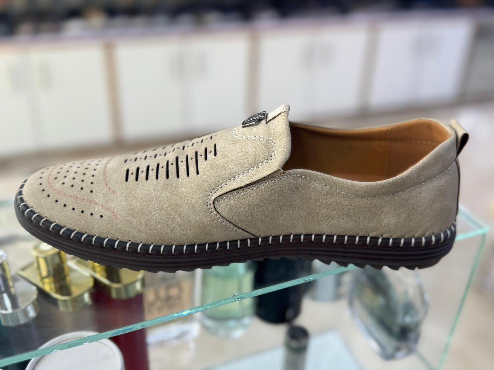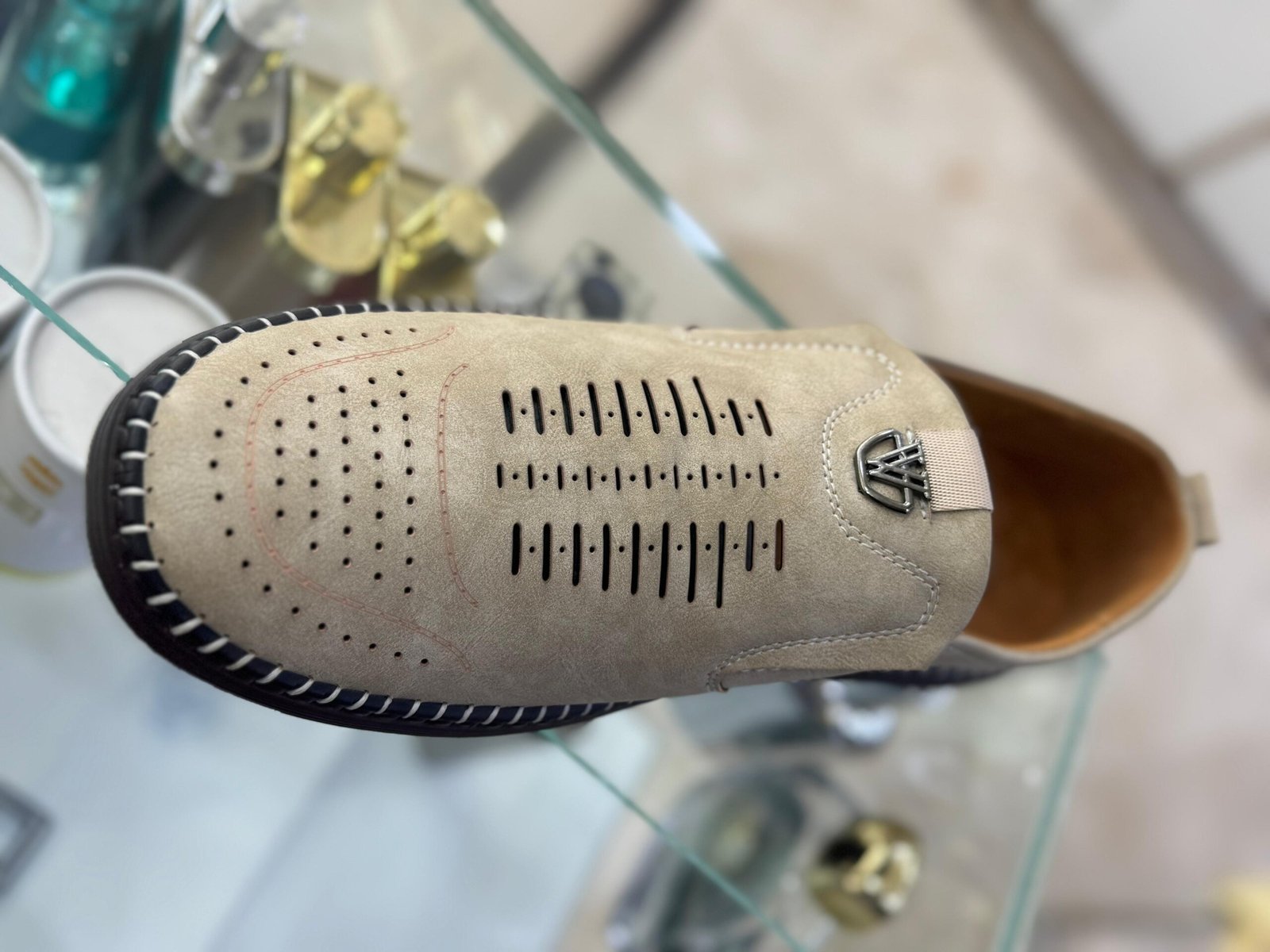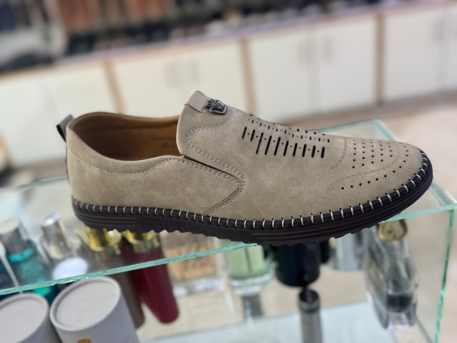 The upper is crafted from a soft, high-quality suede-like material, providing a sophisticated yet relaxed look. The key to its all-day comfort is the vertical perforated design across the vamp, which ensures exceptional breathability and air circulation, keeping your feet cool even on warm days. A discreet metallic accent near the throat adds a touch of modern refinement.